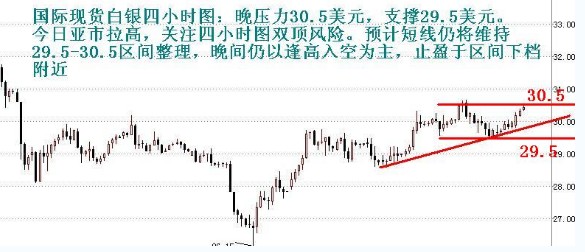 国际现货白银四小时图:晚压力30.5美元,支撑29.5美元。今日亚市拉高,关注四小时图双顶风险。预计短线仍将维持29.5-30.5区间整理,晚间仍以逢高入空为主,止盈于区间下档附近。