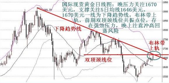 国际现货黄金日线图:晚压力关注1670美元,支撑关注5日均线1646美元。1670美元一线为下降趋势线,布林带上轨,前期双顶颈线位共振点位,存在强劲压力,晚上注意冲高回落风险。